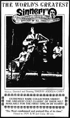 Kind of a more low-budgeted and royally futched-up version of A Face in the Crowd, here, Timothy Carey, the penultimate cinema kook, plays a greasy insurance agent who sees the light, goes off his nut, and becomes an even greasier rockabilly messiah. Promising life eternal for a little cash, his populist movement is co-opted into a run for President but is derailed due to the new prophet's penchant for 14 year old girls. Always meant to track this down, but it looks like TCM is gonna be showing this on The Underground in October.