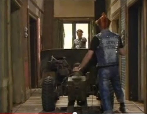 Time opens with a brilliant parody of Dallas, a dream sequence, with Neal as J.R. Ewing. Elsewhere, Rick wakes up and finds a female mass-murderer (Saunders) sleeping next to him and claims they had sex. When it comes to light that he actually didn't, Vyvian chases him around the house with his trusty howitzer until Rick admits he's still a virgin. Nasty finds the boys trying out a new fangled VCR they’ve rented to watch a 'video nasty' (-- a notorious list of films banned by Great Britain over violent or erotic content). Flood finds the house underwater. And in Interesting, they throw a party, mixing the punks, hippies, and anarchists all in one-place, where the expected volatile reaction of these elements has Neal winding up on the moon.