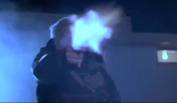 Cut to a high vantage point in the bluffs overlooking the town, where the Albino initiates phase two of his operation, blocking or jamming all communication and transmissions coming in and out of Canyonland and activating some kind of EMP devices on all the roads leading out of town, which promptly fry all the electronics of the Griffiths’ RV, leaving them to hoof it back into town. With Canyonland now essentially and unwittingly quarantined, the Albino adjusts his fancy binoculars back on the diner, where Sheriff Hanks (Kennedy) has just arrived, who is none to happy about this violent disruption of his otherwise quiet small town. But things are about to get a lot worse when Reilly points out the wound on Charley’s leg, which is oozing some kind of green goo [/sound the Plot Point! klaxon/] instead of blood; and Charley has now turned completely green when he flares up again and improbably breaks out of the cruiser, snaps his cuffs, and steals the vehicle while the others look on dumbstruck.