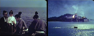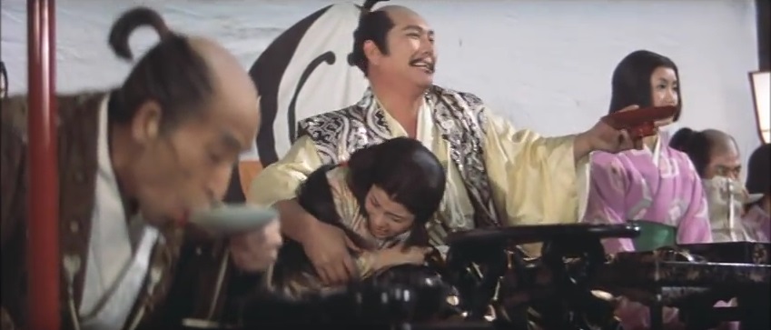 Seeing this as a golden opportunity, Orochimaru tries to turn Sonate to the Dark Side, commanding his traumatized daughter to go back to Ikazuki and poison him. After a substantial browbeating, she reluctantly agrees to honor his wishes but cannot go through with it in the end -- almost, but not quite. Also of note, having seen this tragic scenario played out before with his own lost lover, Zenbei also has a change of heart and takes out “Plan B," his last assassin, currently hiding outside the window of their current refuge. Together, then, they hatch a plan that requires Zenbei to lure Orochimaru to their hideout and away from the castle so Ikazuki can take out Yuki-daijo without his interfering. And do this they all do, quite spectacularly, as our hero interrupts the evil lord’s latest round of drunken debauchery by siccing a giant, fire-breathing horny toad on him (-- right before he *ahem* “deflowers the farmer’s daughter), which destroys most of the citadel as it chases all of Yuki-daijo’s men into the sea. But for the man himself, the honor of his death belongs to Ikazuki, who avenges his father most righteously.