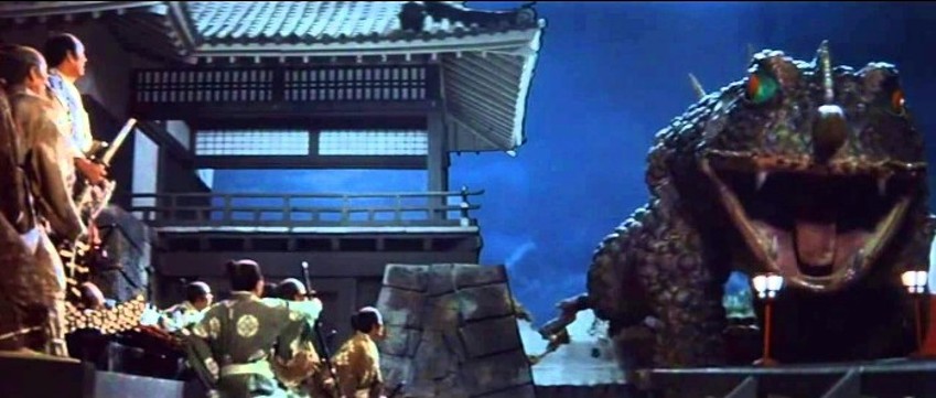 But suddenly! Orochimaru appears, flying in on a fireball, thanking our hero for clearing the way for him to claim the throne. Seems Zenbei’s last assassin wasn’t as dead as he thought, who spilled the beans about his master and Sonate’s betrayal, which gets Zenbei run through with a sword and Sonate left bound to a post to be dealt with later. Anyhoo, this all leads us to the climax, which means it is time for a KAIJU BIG BATTLE! Summoning his dragon once more, Orochimaru’s magical totem engages in combat with Ikazuki’s giant toad, exchanging blasts of fire and water, before slamming together for an outright slobber-knocker, laying waste to what is left of the castle and grounds. Again, it appears the more seasoned Orochimaru has the upper hand, whose dragon soon has Ikazuki’s toad on the ropes. Fortunately, Sonate, rescued by the farmer’s son, feels it is time to employ the spider talisman her grandmother gave her way back at the beginning of the movie.