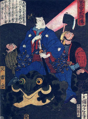 You know, it’s not very often in a film where your hero gets his own head lopped off but still manages to win the fight against a horde of killer ninjas anyway. Ladies and Gentlemen, Boils and Ghouls, welcome to the pure bonkers-bedlam of Tetsuya Yamauchi’s The Magic Serpent (1966). Gleaned from Japanese folklore, the film was based on the legend of Jiraiya (-- later changed to Ikazuchi-Maru), a master ninja who controls “giant toad magic," where he rides around on some over-sized amphibians, fighting evil, and can even turn into a kaiju-croaker whenever the situation calls for it. And in his serialized adventures he falls in love with Sonate, a beautiful maiden, who is a master of “slug magic," and has a running fight with his dreaded arch-enemy, Orochimaru, a former pupil who controls “giant serpent magic." The first recordings of these stories can be dated back to 1806. From there it was expanded to 43 installments between 1839 and 1868, with the first ten chapters adapted by Mokuami Kawatake into stage production, Jiraiya Gōketsu Monogatari [“The Tale of the Gallant Jiraiya”] around 1852.