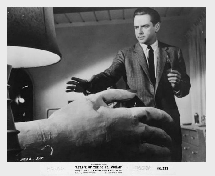 Attack of the 50ft Woman (1958) Woolner Brothers Pictures Inc. :: Allied Artists Pictures / EP: Jacques Marquette / P: Bernard Woolner / D: Nathan Juran / W: Mark Hanna / C: Jacques Marquette / E: Edward Mann / M: Ronald Stein / S: Allison Hayes, William Hudson, Yvette Vickers, George Douglas, Frank Chase, Otto Waldis, Ken Terrell