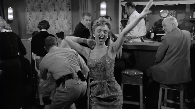 What’s most interesting about Hanna’s script, though, is that it’s more concerned with the sudsy soap-opera elements and sultry melodrama -- think Tennessee Williams by way of Bert I. Gordon -- than the rampaging sci-fi elements, as the ballyhooed attack doesn’t happen until the last ten minutes of the movie; all shot with a stark and solid noir flare by Marquette and Juran -- under the nom de plume of Nathan Hertz. Mix all that up with Ronald Stein’s infectious score and their efforts are both noxious and intoxicating. For between Honey’s provocative dancing, to Nancy’s massive cleavage in her makeshift bed-linen bikini, and factoring in that this was probably the first onscreen French-kiss witnessed by many an impressionable viewer, one cannot deny that this film carries a hefty erotic charge -- an erotic charge all those behind the camera had no idea what to do with or exploit properly. Still, aside from the lousy and laughable FX and that amazing poster art, Attack of the 50ft Woman owes most of its staying power to its two female leads: