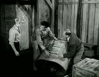 Meantime, the makeshift tank is performing remarkably well at keeping the shrews at bay but everyone is soon exhausted from the excessive weight and stress of the shrews trying to get at them through the slots or tipping them over from below. And after a few harrowing near misses, the group is reinvigorated when they hit the sand, then the water, and then they abandon the barrels and swim for it. Thankfully, the mutated shrews also didn’t sprout any gills, allowing our surviving trio to reach the boat. From there, Craigis comments that in less than 24 hours there will only be one shrew left on the island, and then it, too, will die of starvation; an excellent example of overpopulation. To which Sherman replies, as he embraces Ann, that he isn’t all that concerned about that problem just yet.