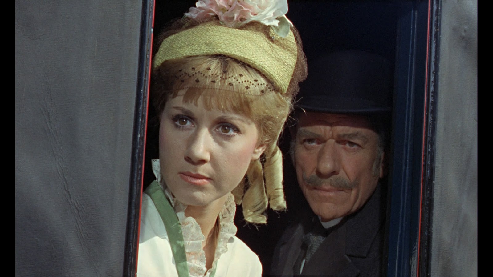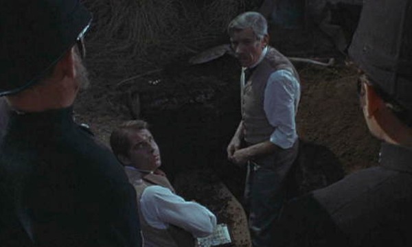 There is a bit of a bump along the way, though, when they run into a pack of obnoxious fox-hunters, led by a bloke named Denver (Davion) -- the assholiest asshole of this mounted bunch, and the sympathetic Sylvia purposefully points them in the wrong direction, giving the poor animal at least a temporary reprieve. But when they reach town, just as a funeral procession is heading out to the cemetery, Denver leads a reckless charge toward their carriage, overwhelming the casket bearers, who wind up dropping the coffin off a bridge, where it shatters on impact, revealing its ghastly contents. And after getting an earful from Denver and a threat to never cross him or his party again, both Forbeses catch a glimpse of the exposed corpse. Then, strangely enough, Martinus (Hammond), the brother of the dead man, is so afraid of Denver and his hooligans he blames these strangers for the disruption. Finding he won’t listen to reason, and growing more belligerent by the second, Forbes and his daughter withdraw for more friendlier environs.