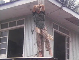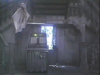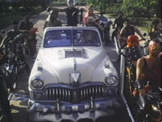 Fair warning, The Raiders of Atlantis (1983) -- a/k/a Atlantis Inferno a/k/a Atlantis Interceptors, is nowhere near as coherent as I’m making it out to be as most of that summation is based on conjecture and conjecture alone. See, after an opening reel that will leave your eyes spinning as your brain tries to process just what in the hell is going on, the film settles into a pretty creepy groove as the survivors make their way through the burnt out, corpse-ridden streets and razed buildings (-- special shout-out to the scene with a ghostly strung-up corpse that keeps swinging into a jukebox, causing it to skip and play the same snippet over and over again, drawing our heroes in to make the grisly discovery), and have several running gonzo firefights with the raiders -- finding a handy Rite-Aid stocked to the gills with weapons, ammo, and plenty of store-brand liquor for Molotov cocktails.