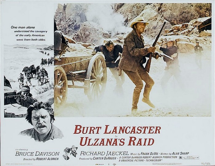 Ulzana's Raid (1972) The Associates and Aldrich Company :: De Haven Productions :: Universal Pictures / P: Carter DeHaven, Harold Hecht, Burt Lancaster / AP: Alan Sharp / D: Robert Aldrich / W: Alan Sharp / C: Joseph F. Biroc / E: Michael Luciano / M: Frank De Vol / S: Burt Lancaster, Bruce Davison, Jorge Luke, Richard Jaeckel, Joaquín Martínez, Karl Swenson, Douglass Watson