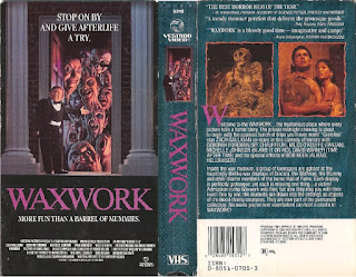 I fell in love with Waxwork when first encountered during its limited theatrical release, catching it several times at the old Imperial 3. And it was one of the first VHS tapes I ever purchased new and quickly wore it out. I loved the whole concept and the execution, with some excellent creature and gore effects courtesy of Bob Keene and his merry band of muckrakers, and soon became obsessed with the stories not told of how the other victims came to be in the museum and the situations that led them to be frozen in that particular moment in the displays.