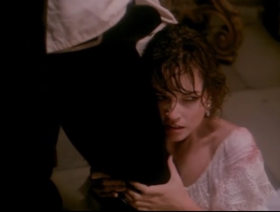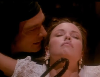 Oh, and Count Dracula (Miles O’Keefe), too, currently trying to sink his fangs into China, who was compelled to come into the display for a closer look at this handsome fella. Now, it should be noted that Hickox plays the Count as an Anne Ricepire, meaning this might not be Dracula at all; and what follows, well, the viewer will find it either hopelessly grotesque or freaking hilarious, or perhaps a combination of both, as China must fend off attacks from Dracula’s recalcitrant son and his concubines, with the help of her “fiance”, whom she unwittingly dined on earlier (-- long story), in the bloodiest ways imaginable as they tend to explode real good when punctured by wooden stakes with copious amounts of erupting gore. Alas, the girl is unable to resist when the Count swoops in, offering herself up, finishing this interlude with two distinct puncture wounds, and filling up one more display with another obscured victim.