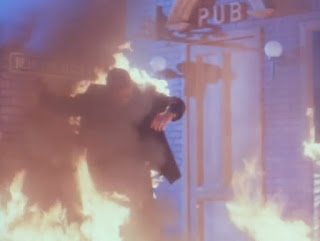 Suddenly finding himself lost in the woods, Tony at first thinks China has spiked him with acid, again, but that wouldn’t explain his change of clothes to peasant garb, the massive hair growth, and the scent of pine. And as the full moon rises he heads toward a cabin, looking for answers, whose interior looks suspiciously like the waxwork display one should note. He also finds a man inside (John Rhys-Davies), who implores him to flee, flee for his life, but it’s already too late. And as the moonlight seeps through the window, the man begins to change into werewolf, who pursues the terrified Tony around the cabin, finally cornering him and burying his fangs into the victim’s shoulder just as two more men enter the cabin. And while the older man fumbles to get a silver bullet loaded into his rifle, the beast tears his companion asunder.