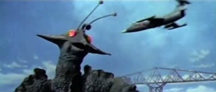 Yes, the monster, Guilala, looks patently asinine, whose origins appear to be a prop rubber chicken with bulging thighs, wobbly antenna, and the inexplicable aero-dynamic noggin; but the real problem lies not in his appearance but in his execution as the director fails to shoot him at a higher speed so it will play back looking slow and ponderous as it accumulates all that extensive property damage. Nihonmatsu also stubbornly refused to hardly ever shoot the monster from any other angle except straight on, giving Guilala no real sense of scale. The miniatures the giant alien gets to demolish, courtesy of Hiroshi Ikeda, are quite effective but, again, due to a lack of technique the tanks, the knock-off masers (-- which prove equally ineffective), and the jets it fights will never be mistaken for anything other than the toys and models they really were. (Some stock military footage might’ve helped here.)