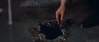 And after a cursory examination of the spore, sticking with proper protocols, apparently, Dr. Kato gives everyone the night off so they can come to his house for a celebratory booze-can. But the party is interrupted mid-cocktail with word from the lab saying there’s been an accident, the specimen has been destroyed, and it looks like something smashed through the floor. Well, upon further review it looks like something melted through the floor. And closer examination of the remnants of the spoor sure resembles broken egg shells to me. They also find what appears to be the footprint of a giant chicken seared into the floor.