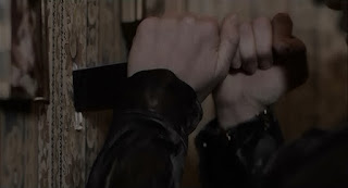 When she awakens in the closet, Annie is bound hand and foot and her hair is knotted around a drain pipe (-- I’m assuming the same way mom used to do it). And as she struggles to free herself, Annie manages to weaponize a wire coat hanger and gets the door open, which reveals Barlow coming for her with his trusty knife.