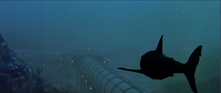 Meantime, the shark appears to have killed either Cindy or Sandy in the resulting underwater melee. In the control room, Mike and Kay join Bouchard and two technicians, thinking they’re at last safe, not realizing the shark is currently drawing a bead on the observation window!