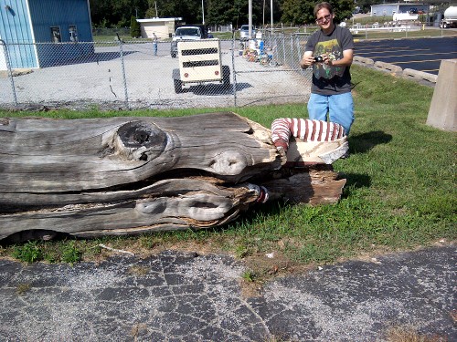 Said manager was very forthcoming as we clogged up the drive-thru lane and got our explanation. Turns out when the restaurant moved there was an effort to relocate the statue along with it. Unfortunately, the stump was so termite ridden this became an impossibility, and so, He Who Walks Between the Arches was felled and abandoned back in the old lot. As we listened to this tale, stunned and forlorn, we were told HE was probably still over there. BUT! Something else had happened. Something truly odious and needling toward disturbing. And as we pulled in and found Him, and went in for a closer look. This is what we found...