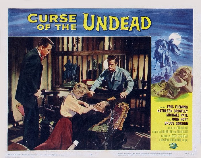 Curse of the Undead (1959) Universal International Pictures / P: Joseph Gershenson / D: Edward Dein / W: Edward Dein, Mildred Dein / C: Ellis W. Carter / E: George Gittens / M: Irving Gertz / S: Eric Fleming, Michael Pate, Kathleen Crowley, John Hoyt, Bruce Gordon, Helen Kleeb
