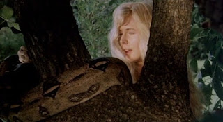 Adam christens his new companion, Eve (Goldman), and the two were happy and content for a (very short) time. See, Eve, unfortunately, isn’t so easily entertained as the dimwitted Adam and soon grows bored with the tedium of paradise. (I mean, How long can a person just sit there and stare confusedly? At nothing?) And so, she soon comes under the influence of a talking snake, who encourages her to eat of the fruit from the Tree of Knowledge. This, of course, is forbidden; but no matter how many times Adam says not to eat from it, this only makes Eve want to do it more. Soon enough, she gives in to temptation and takes a bite from what turns out to be the Tree of ‘Carnal’ Knowledge as Adam, ever the dimwit, takes a bite, too. And once they’ve both supped, they both get to fornicating something fierce -- officially bringing sin into the world.