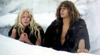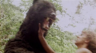No-no! Instead, this movie then kicks it's already laughably high rock-stupid quotient up a few more notches with thee most unfortunate looking bear attack in cinema history. And when this ratty bear-prop gets the drop on Eve (-- don’t ask), Adam springs to her defense but proves about as useful as you’d expect, leaving it to Kevin to save their hash, again, as he dispatches the bear after … well, I’d hate to actually call that display a ‘fight’. Regardless, the bear suit is dead and Kevin moves to claim his prize: Eve. But for some reason, Eve decides to dump him and stay with the party that brung ‘em -- I mean, her. But an angered Kevin fights for her and cleans Adam’s yet to be invented clock. But as he moves in for the kill, Eve begs him not to kill Adam. Seeing who she truly loves, Kevin spares Adam, gives Eve one last look, who won’t return it, and then disappears into the trees, never to be heard from again.