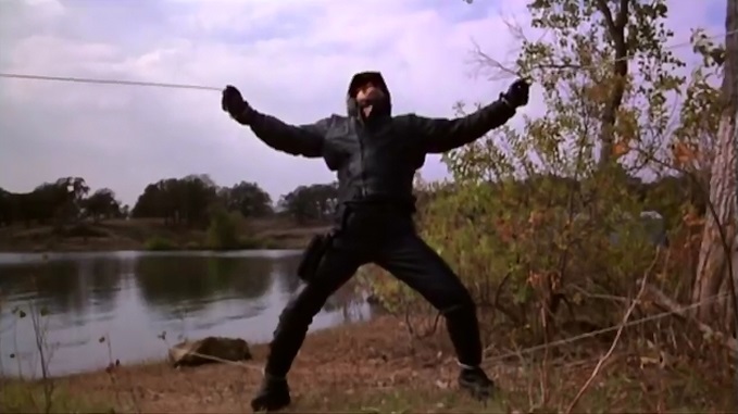 Of course, Coldyron blows it with the off-switch, leaving it to Steele to combat ROTORCOP hand to hand while that idiot pulls a plan B out of his ass. And what he finds in his ass is some primer det-cord that he uses to lasso ROTORCOP. (It was a thing, back at the beginning, with the character, he was clearing stumps, and AHHHH, just forget it.) But, this move comes too late for Steele, who dies after she tears open ROTORCOP’s fleshy outer shell and is electrocuted by his exposed innards. And soon enough, thanks to some really shitty editing that doesn’t quite make up for the nonsensical staging, Coldyron has got that infernal contraption roped up, stretched out, and prepped to be drawn and quartered once he gives Sonya the signal to floor it. And thus, finally, we find the one thing ROTORCOP does well: exploding.