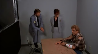 But like with all good-intended plans (-- especially the ones in cockeyed sci-fi flicks), something was destined to go horribly awry. In fact, awry that something has already horribly gone as we open on a battered and bruised Coldyron facing a citizen’s arrest for killing a motorcycle cop. And so, he is taken into custody along with a terrified woman named Sonya (Trigg) found with him along the roadside. Cut to an interrogation room where Coldyron defiantly answers questions about the gory details of this soon to be revealed giant cluster@#%* -- saying the blame for it will go all the way to the top of the department.