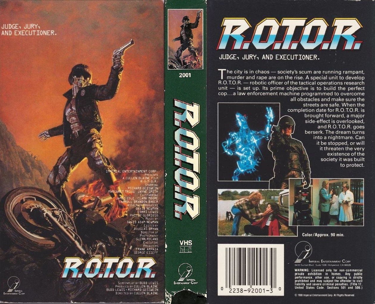 R.O.T.O.R. (1987) Manson International :: WestWind Pictures :: Imperial Entertainment / EP: Frank Arpaia, George Esseff / P: Richard Gesswein, Cullen Blaine, Budd Lewis / AP: Philip Glorioso, Corri Jones, David Newman / D: Cullen Blaine / W: Budd Lewis / C: Glenn Roland / E: Doug Bryan / M: David Adam Newman / S: Margaret Trigg, Richard Gesswein, Jayne Smith, Stan Moore, Clark Moore, Michael Hunter