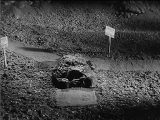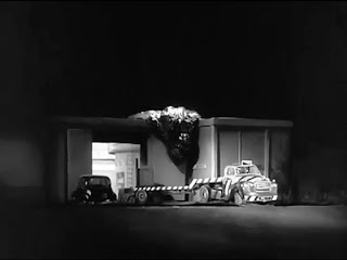 Royston also doesn’t think Major Cartwright’s military solution to the problem will be effective but can do nothing to stop it as the commander orders flamethrowers to coat the fissure with napalm before dropping several satchel charges into the breach, hoping the impact will kill the thing, before covering the whole thing over with cement. This, of course, works about as well as filling a gopher hole in with dirt. So, of course, the creature breaks through to the surface again -- only this time we finally get a look at this glowing, undulating, free-form mass of goop as it overruns a car and melts all four of the passengers.