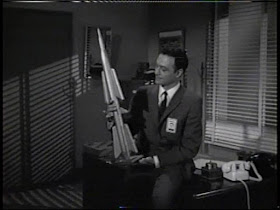Meanwhile, that massive rogue missile, whose outer space origin was confirmed during the opening credits, has now achieved a sustained orbit some five miles above the surface, is traveling at nearly 4,200 miles an hour, and is generating enough radioactive heat to leave a ten-mile wide swath of utter destruction in its wake as it crosses the Bering Strait and scorches a trail across the Alaskan frontier. Here, it is picked up by the outermost pickets of the DEW line, who alert CONAD (-- and if you don’t know what all that alphabet soup means, go read my earlier review of The Deadly Mantis and all will be made clear). A jet is scrambled to intercept, but the rockets it fires cannot penetrate through the massive heat blister surrounding the missile, which continues on, consuming the jet and passing over the radar station that first detected it, which is obliterated in a blinding flash of heat and light.